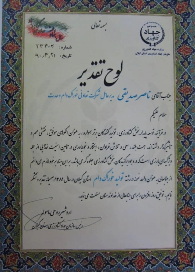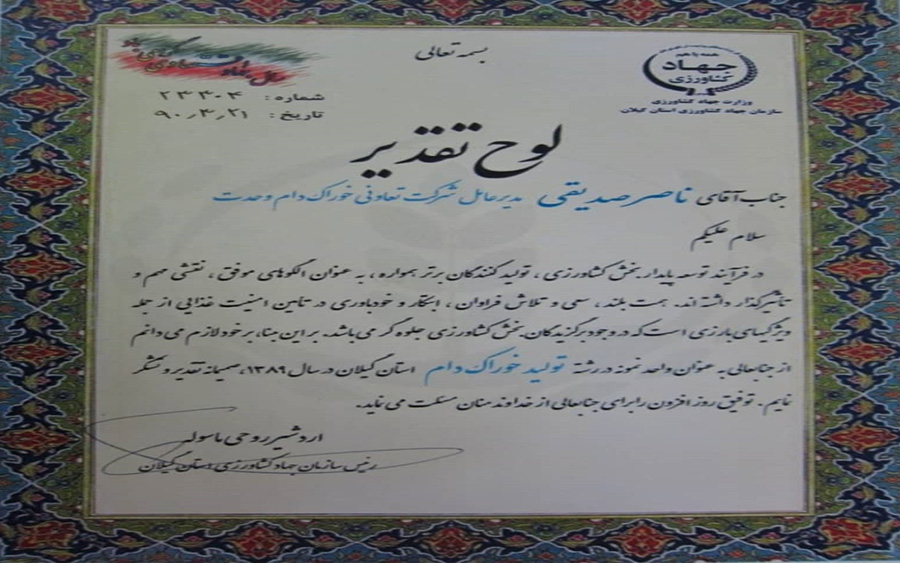 در همین راستا این شرکت از زمان تاسیس تاکنون موفق به دریافت استاندارد iso 9001و iso 22000 و لوحهای تقدیر در سالهای مختلف و تولید کننده برتردرسال 1389معرفی گردید.